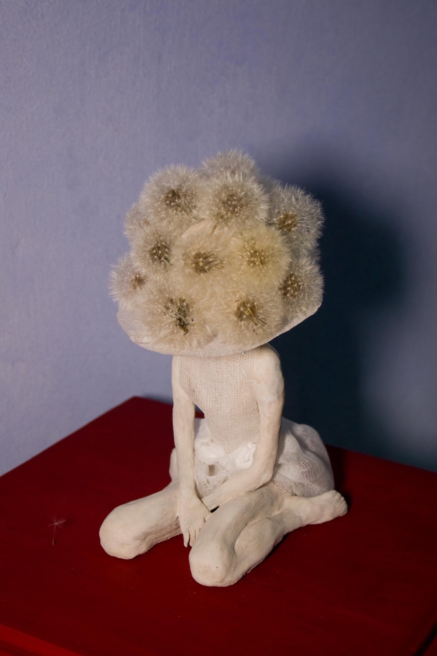 Carla Bedini, Greta, cm30x30x37, scultura carta pesta e soffioni, 2019